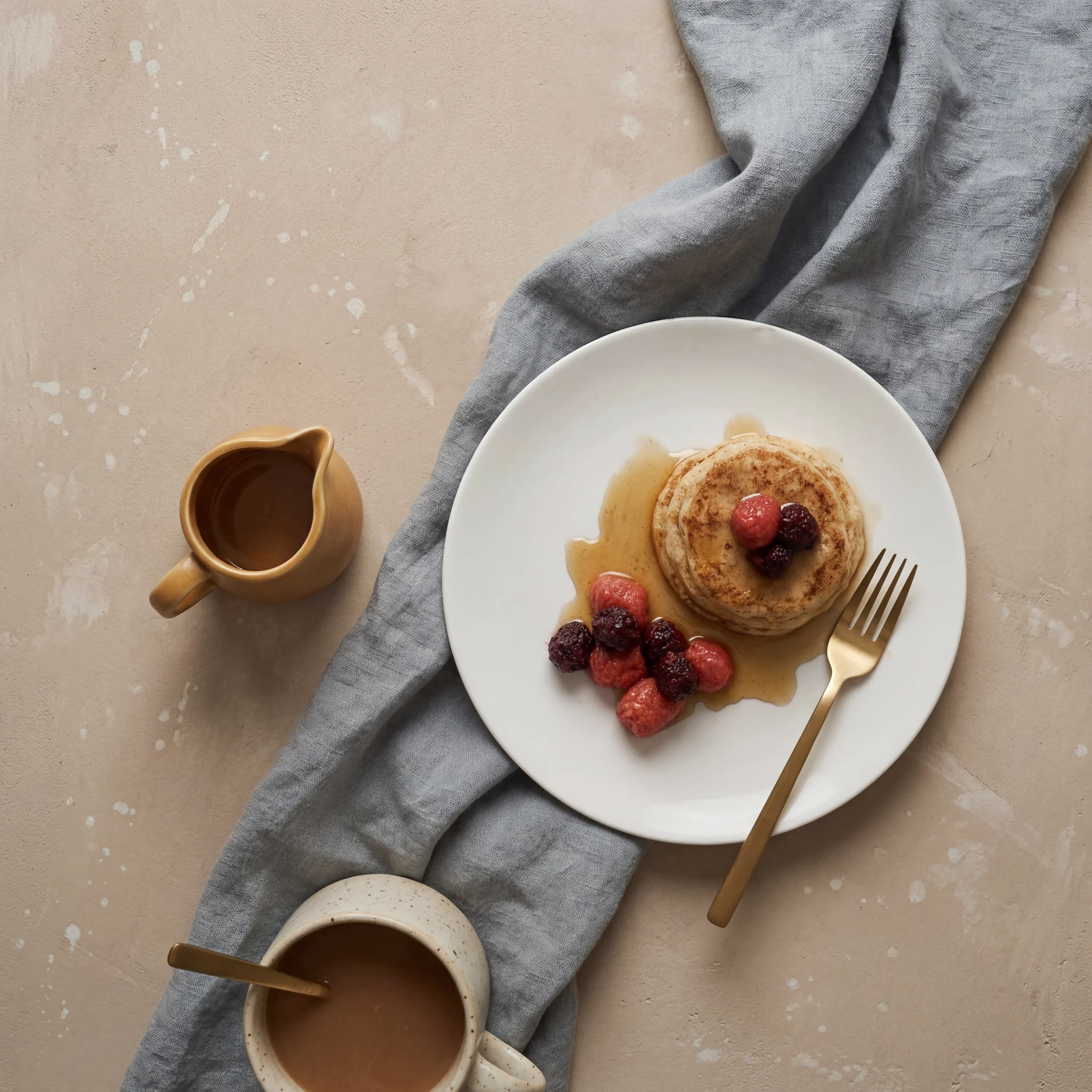 Fluffy pancakes with maple syrup and mixed berries.