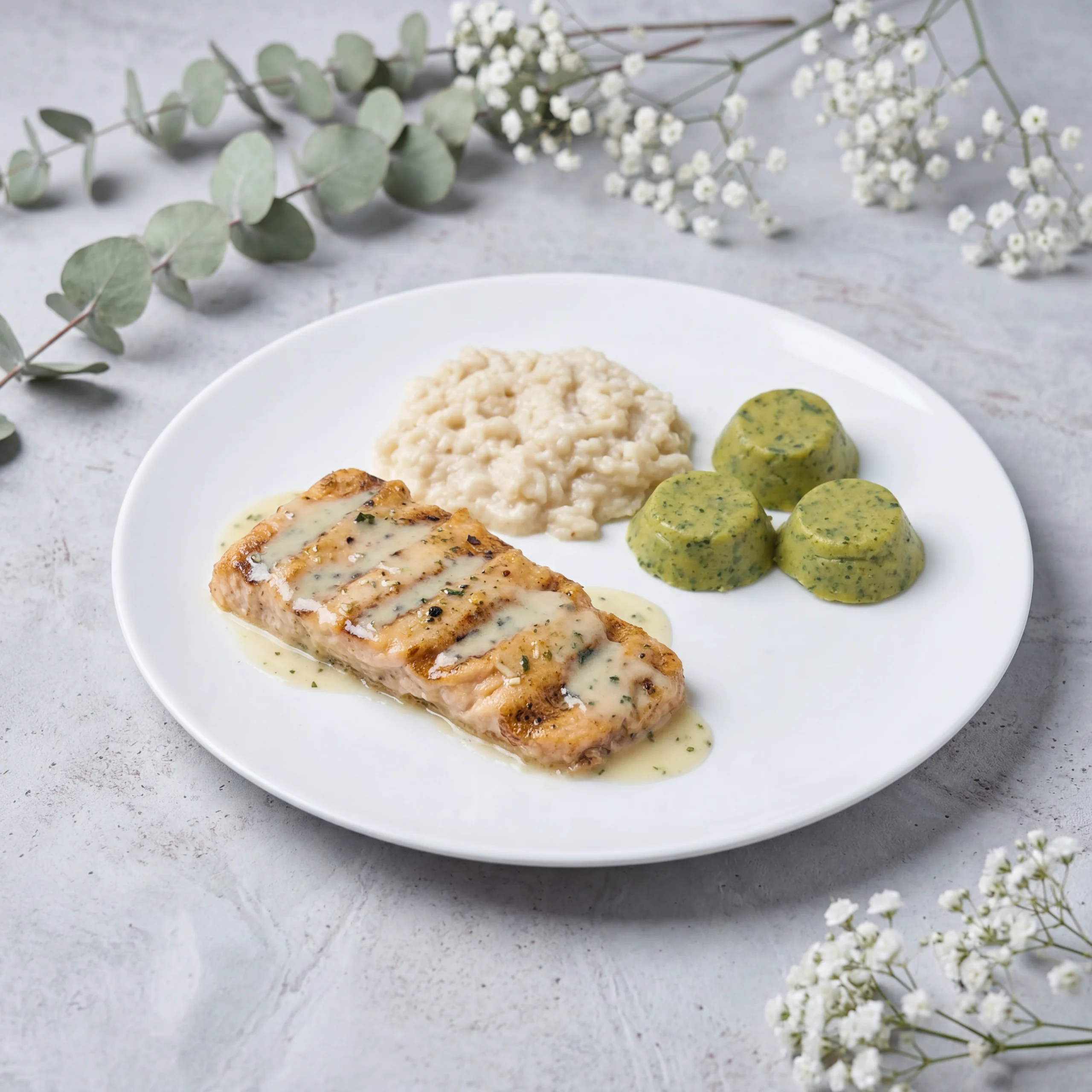 Succulent pink salmon seasoned perfectly with paprika and chipotle, served with brown rice and zucchini parsley rounds.